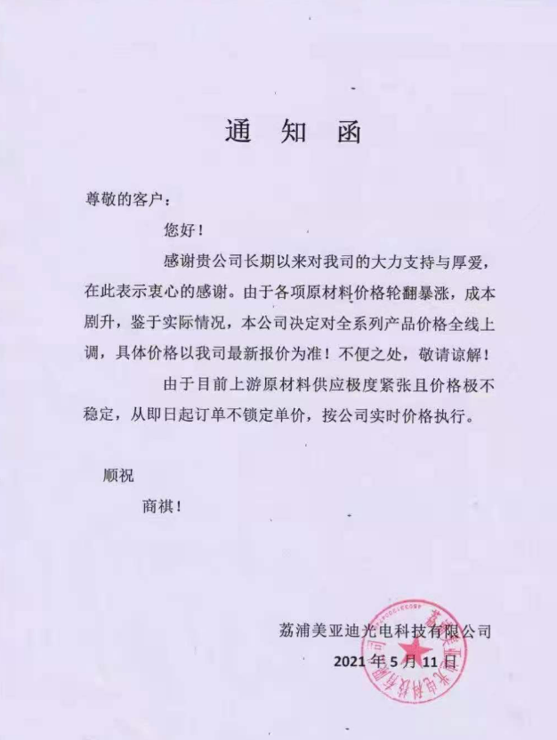 5月17日,利亞德發(fā)布LED顯示產品全球提價通知“鑒于上游主要原材料(半導體芯片、燈珠、PCB等)的供應日益緊張以及成本較大幅度的上漲,利亞德將從即日起在全球全面提高產品出廠價。”一石激起千層浪,頓時在行業(yè)內引發(fā)巨大反響。