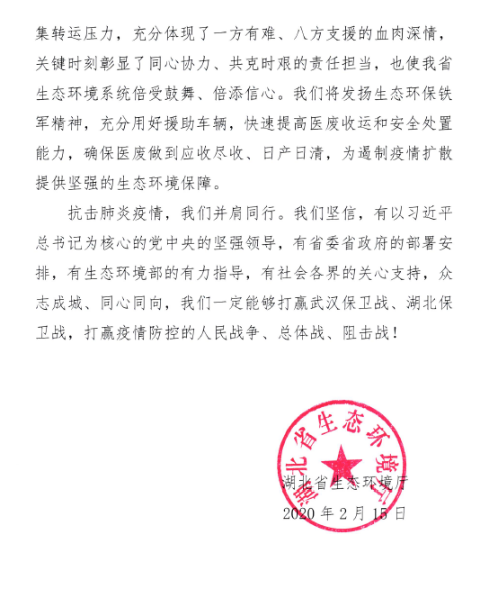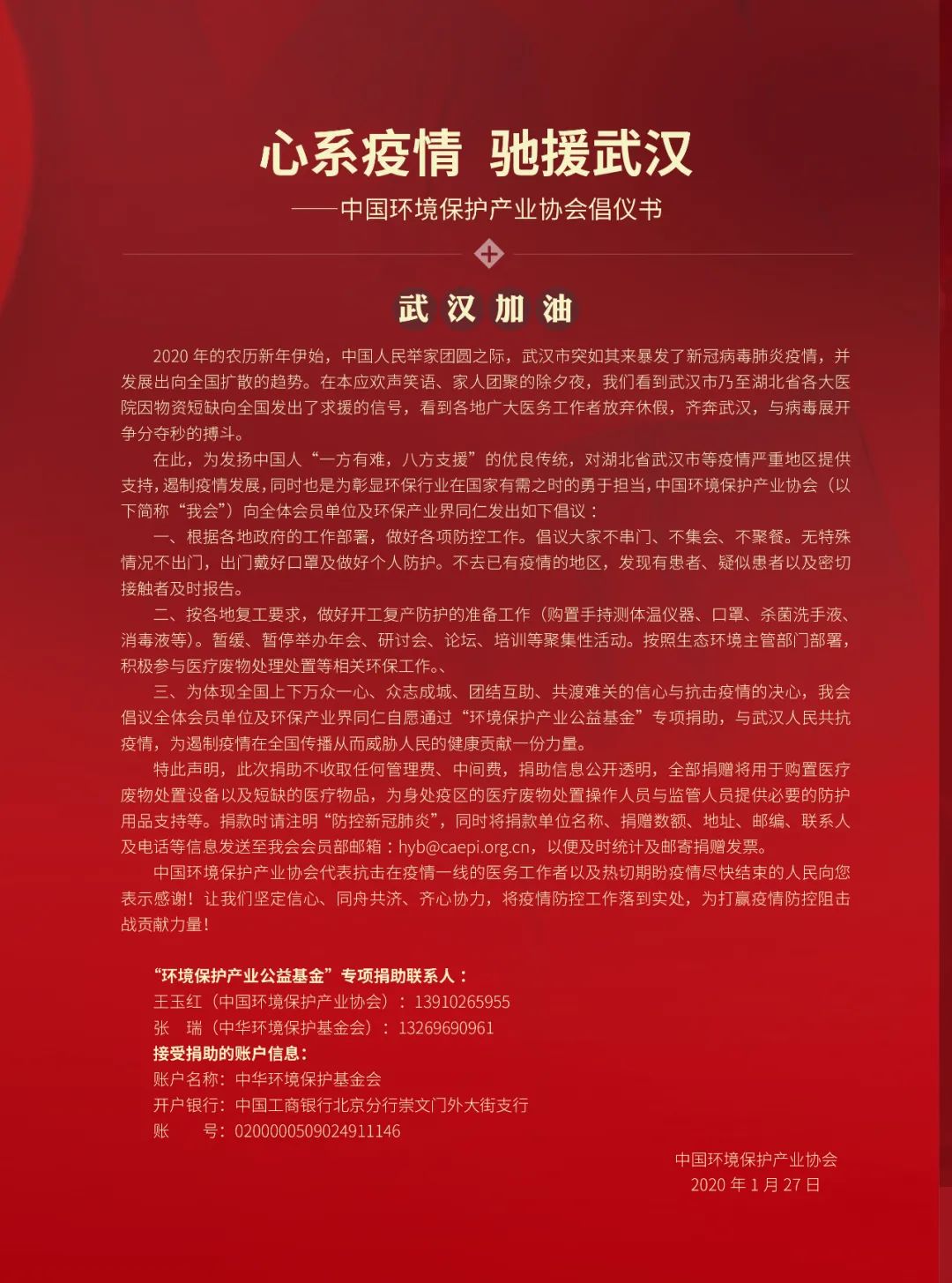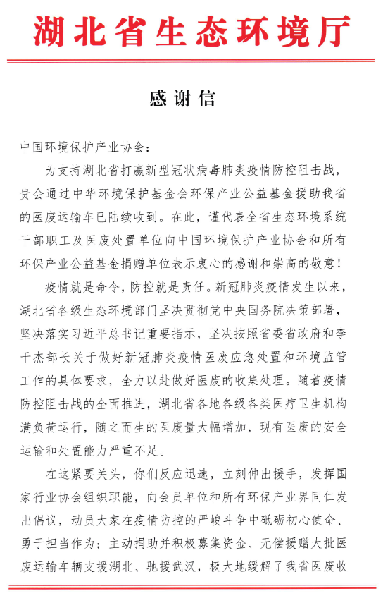 4、1月31日,為發(fā)揚(yáng)中國人“一方有難,八方支援”的優(yōu)良傳統(tǒng),對湖北省武漢市等疫情嚴(yán)重地區(qū)提供支持,我會向全體會員單位及環(huán)保產(chǎn)業(yè)界同仁發(fā)出發(fā)布 “心系疫情馳援武漢——中國環(huán)境保護(hù)協(xié)會倡議書”,籌集捐款約290萬元,購置65輛醫(yī)廢轉(zhuǎn)運(yùn)車,支援湖北抗疫。