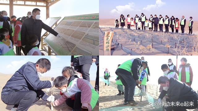 為弘揚(yáng)民勤防沙治沙精神,鼓勵(lì)公眾參與助力當(dāng)?shù)厣鷳B(tài)持續(xù)改善,2022年12月24日,十余組甘肅當(dāng)?shù)刂驹刚?,在武威市環(huán)境保護(hù)產(chǎn)業(yè)協(xié)會(huì)和“綠動(dòng)未來(lái)”平臺(tái)的帶領(lǐng)下,前往騰格里沙漠。大家與治沙英雄石述柱之子石光明一起,探視并養(yǎng)護(hù)了“綠動(dòng)未來(lái)”民勤1號(hào)林,近距離觀摩學(xué)習(xí)了“民勤模式”科學(xué)治沙技術(shù),并將所學(xué)轉(zhuǎn)化為切實(shí)的植樹(shù)成果,攜手在騰格里沙漠再植10,000余棵梭梭樹(shù)苗,落成又一片“綠動(dòng)未來(lái)”愛(ài)心林。